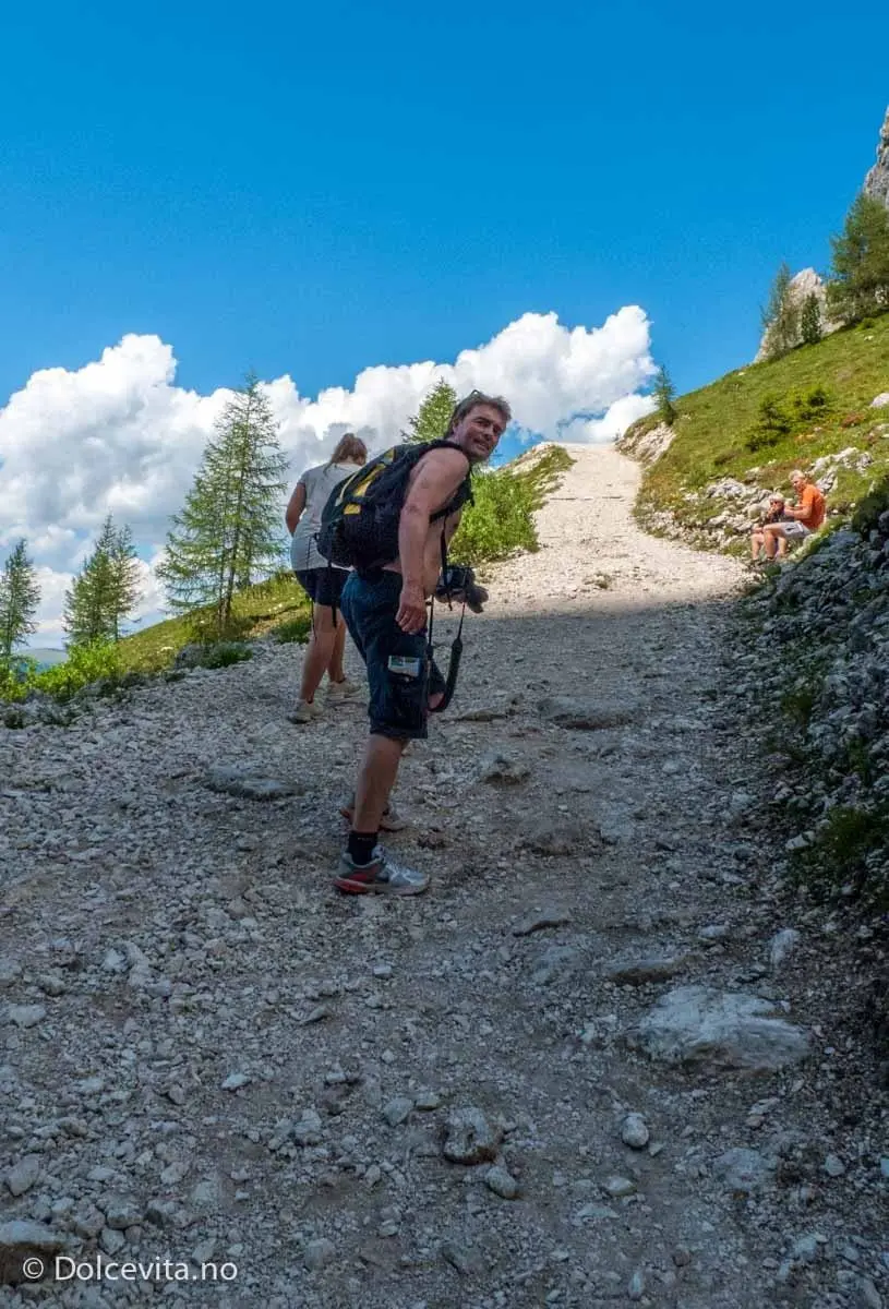 Akkurat tiden er litt viktig, for veien opp gjennom passet stiger hele veien, helt frem til kanten helt over på den andre siden av fjellet, der hytta Rifugio Demetz ligger. Derfra går det stupbratt ned, men det finnes en gondolbane man kan ta ned. Den går også om sommeren, det vet vi, om med en drøy times marsj rekker vi fint over før siste gondol for dagen går klokka fem.
