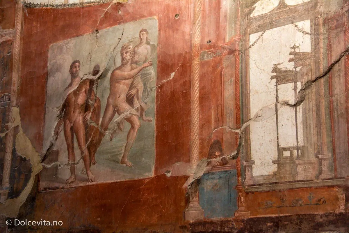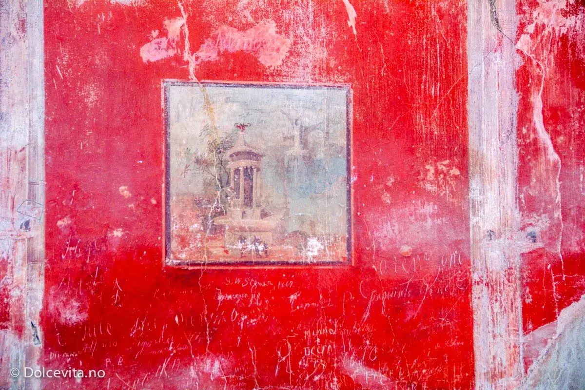 – Se her, sier en fransk dame og stryker fingrene over et svært veggmaleri. Gulvet her har også nedfelte marmorstykker i fine farger. I taket over oss, som var delvis intakt, fortsatt med avsvidde trebjelker, stråler lyset ned gjennom en åpning. Den er laget slik at den også samlet regnvann til et lite basseng i midten av rommet. – Det er da både fantastisk og ganske merkelig, sier hun, at man kan gå så nær og virkelig kjenne på disse eldgamle kunstverkene?