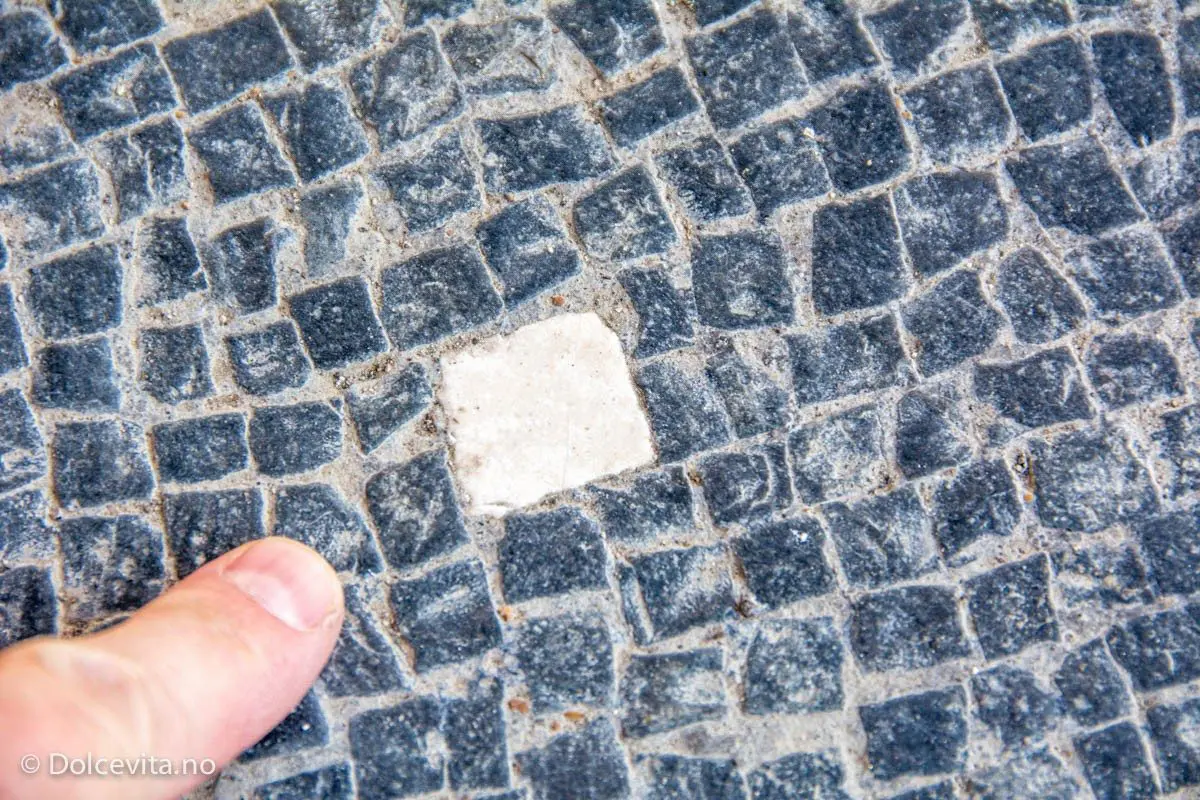 Og så, inn i en smal bakgang i et hus: Jeg lar øynene venne seg til mørket for å studere en bakerovn: Da oppdager jeg at gulvet i hele gangen jeg står og går i er dekket av en finrutet mosaikk. Små fliser bare en halv centimeter i firkant, lagt sirlig på plass én og én. Og dette går vi på. I dag. Det føles helt spesielt og ganske utrolig.