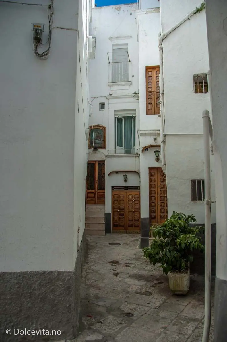 Men våre italienske venner undrer seg: Slike orkestre brukes bare til gravferder, men denne musikken er altfor munter. Inn gjennom trange gater (det er utrolig hvor de finner det nødvendig å skilte med Parkering forbudt), forbi duomoen, over et torg og forbi vegger og porter med forklaringen på festivitasen: En av Martina Francas fruer hadde gått bort.