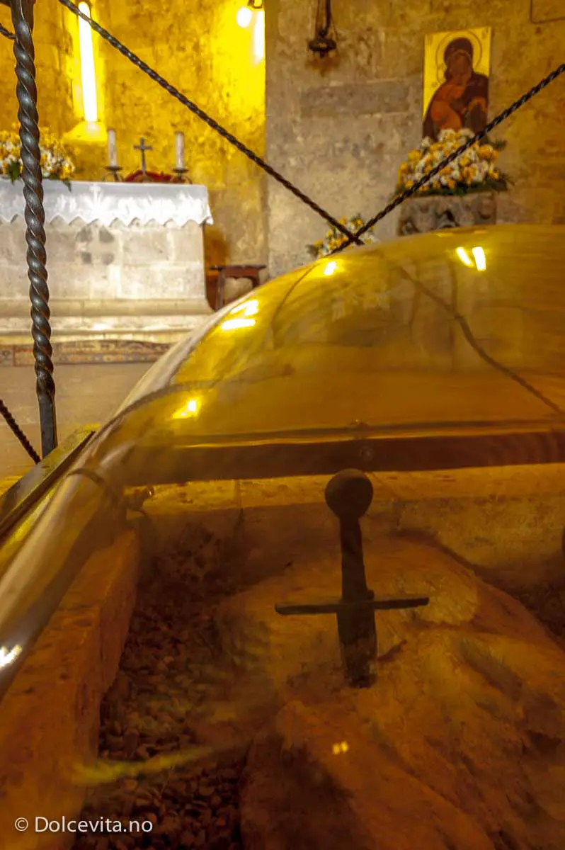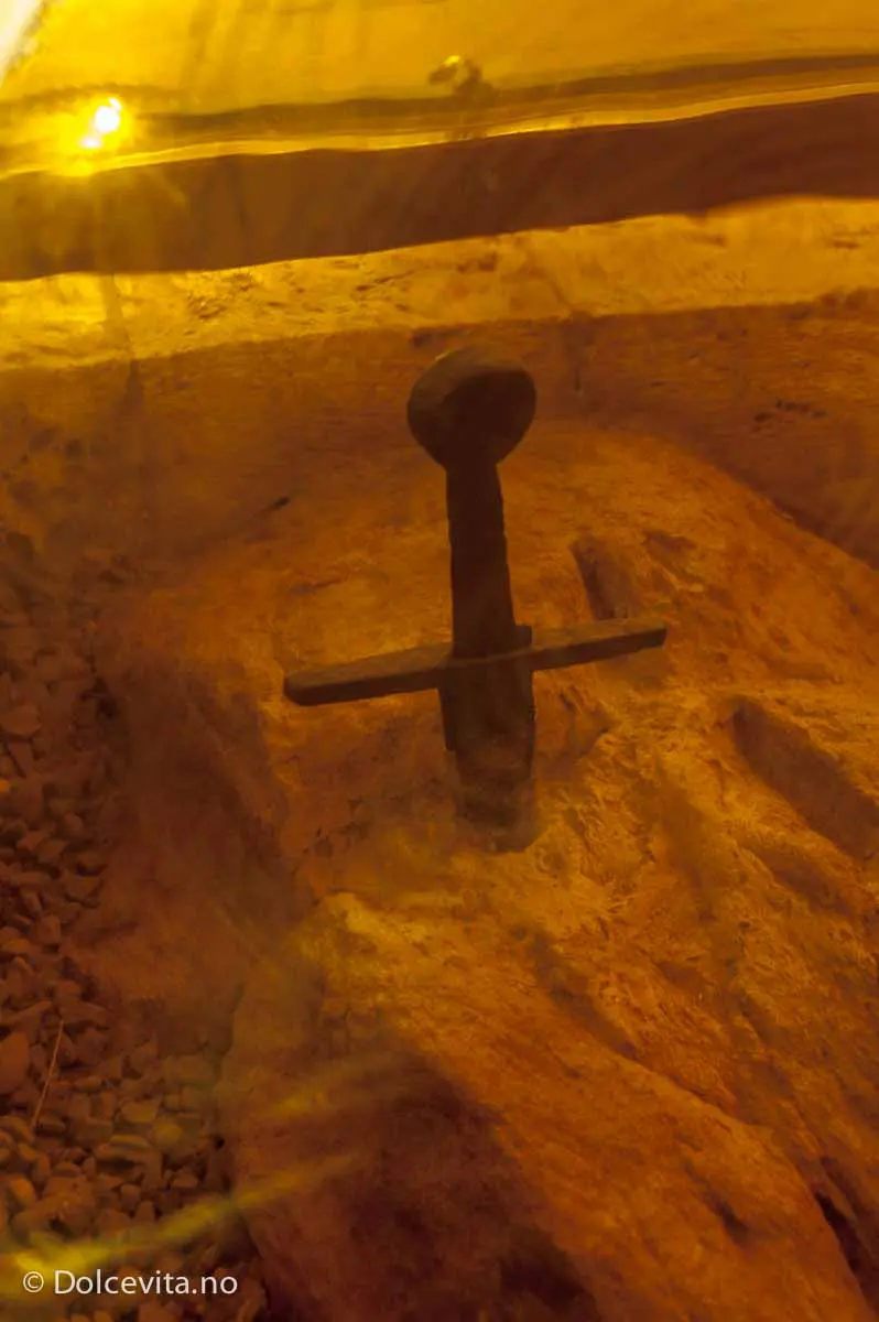 Det var her, fem år tidligere, at Galgano drev sverdet sitt ned i steinen med så stor styrke at ingen noen sinne har greid å trekke det ut igjen.
