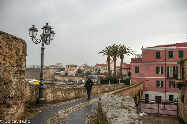 Alghero er hyggelig, selv om (?) du kan støte på nok av andre nordmenn her. (Vi har ikke truffet én nordmann på tur her som har sagt noe negativt om Alghero, kysten eller øya.) Særlig bymuren ut mot havet, med vakttårn og skyteskår er en flott tur, selv med paraplyer.