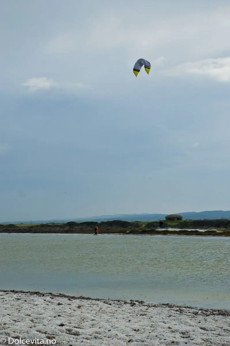 Så ser vi dem, helt oppe mot Stintino, men bare nesten ute i havet: To kiter suser bortover himmelen. 15 meter under henger et par lekeglade voksne i våtdrakter mens de skummer bortover det flate vannet. Det kites, og dét er aller best i et digert, naturlig avlukket basseng der bølgene ikke får plass til å bygge seg opp.