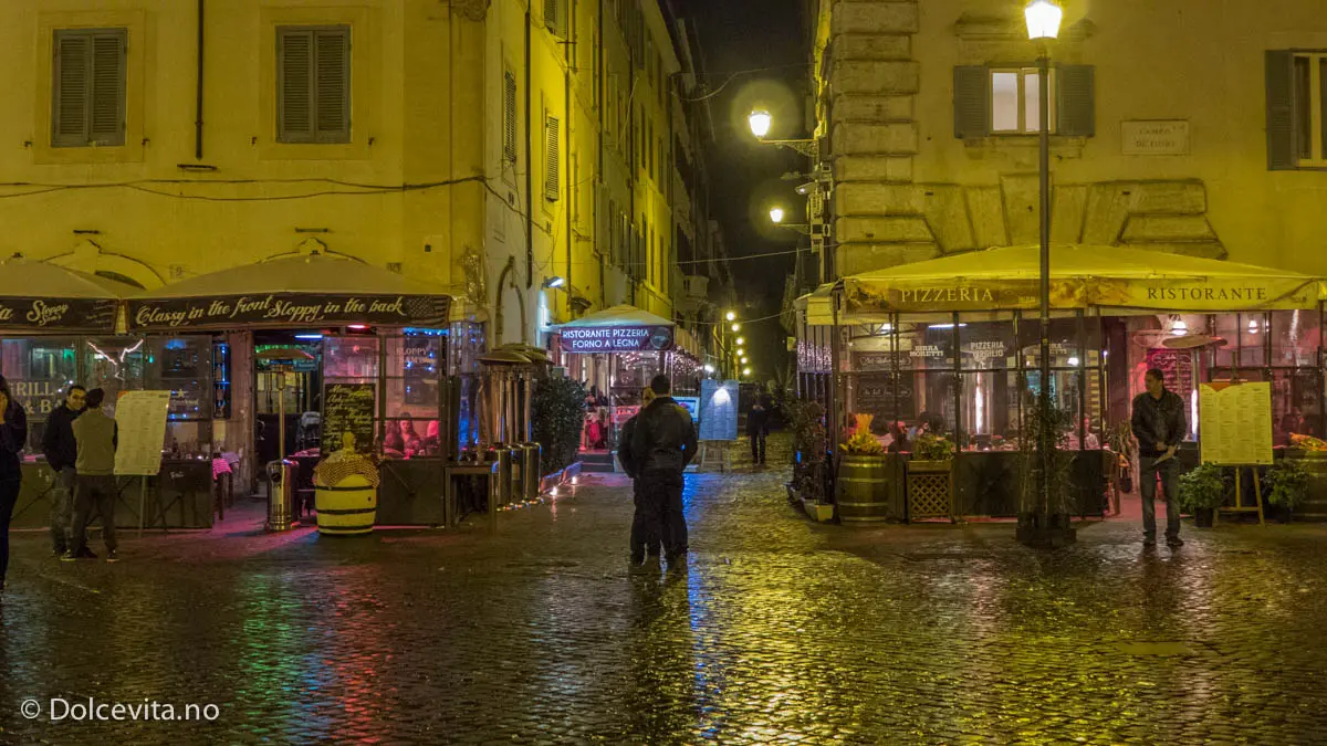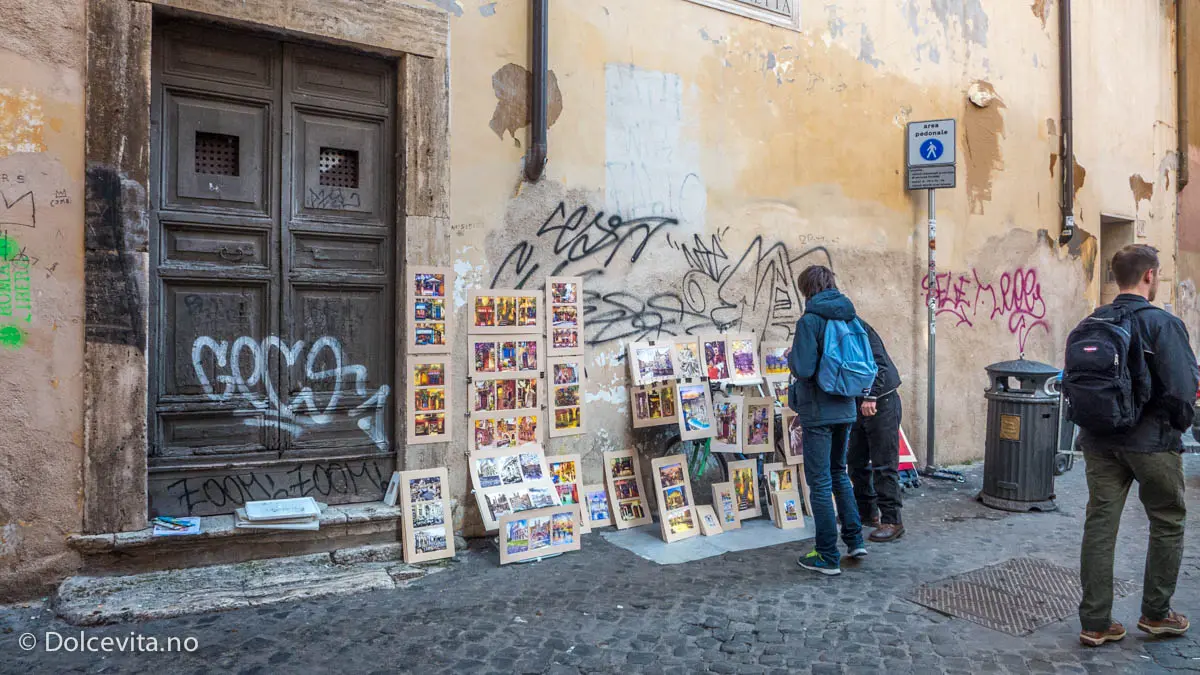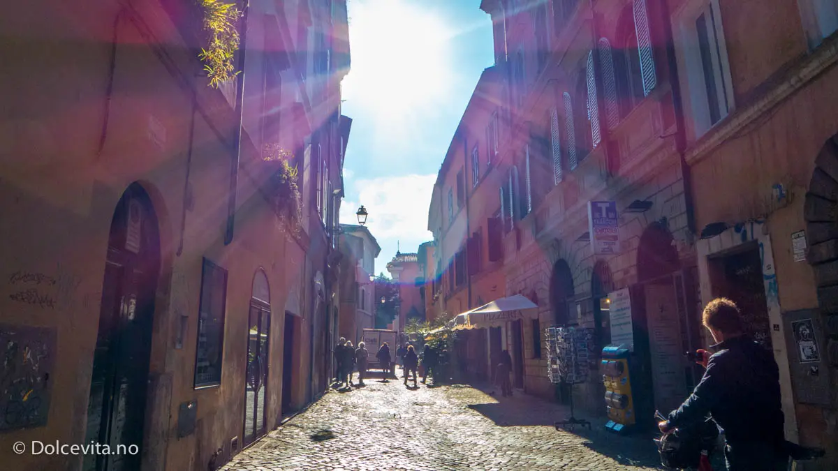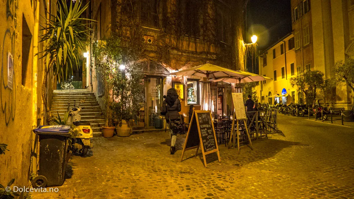 Det myldrer av folk i Trastevere, kanskje aller mest om kvelden. Restauranter og puber ligger tett i tett, det er gateartister og tett folkeliv.