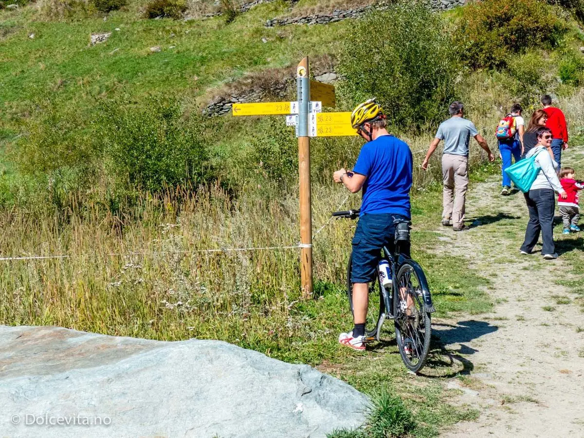 Turfolket her har funnet på noe smart: Ulike stier har ulik gradering. Bokstavkoder på skiltene forteller om de er flate nok for sykkel, greie å gå eller rett og slett krevende. Se på koden for stien du kommer fra, så forstår du hva som er hva. Vi er mer enn fornøyd med utsikten fra dalbunnen.