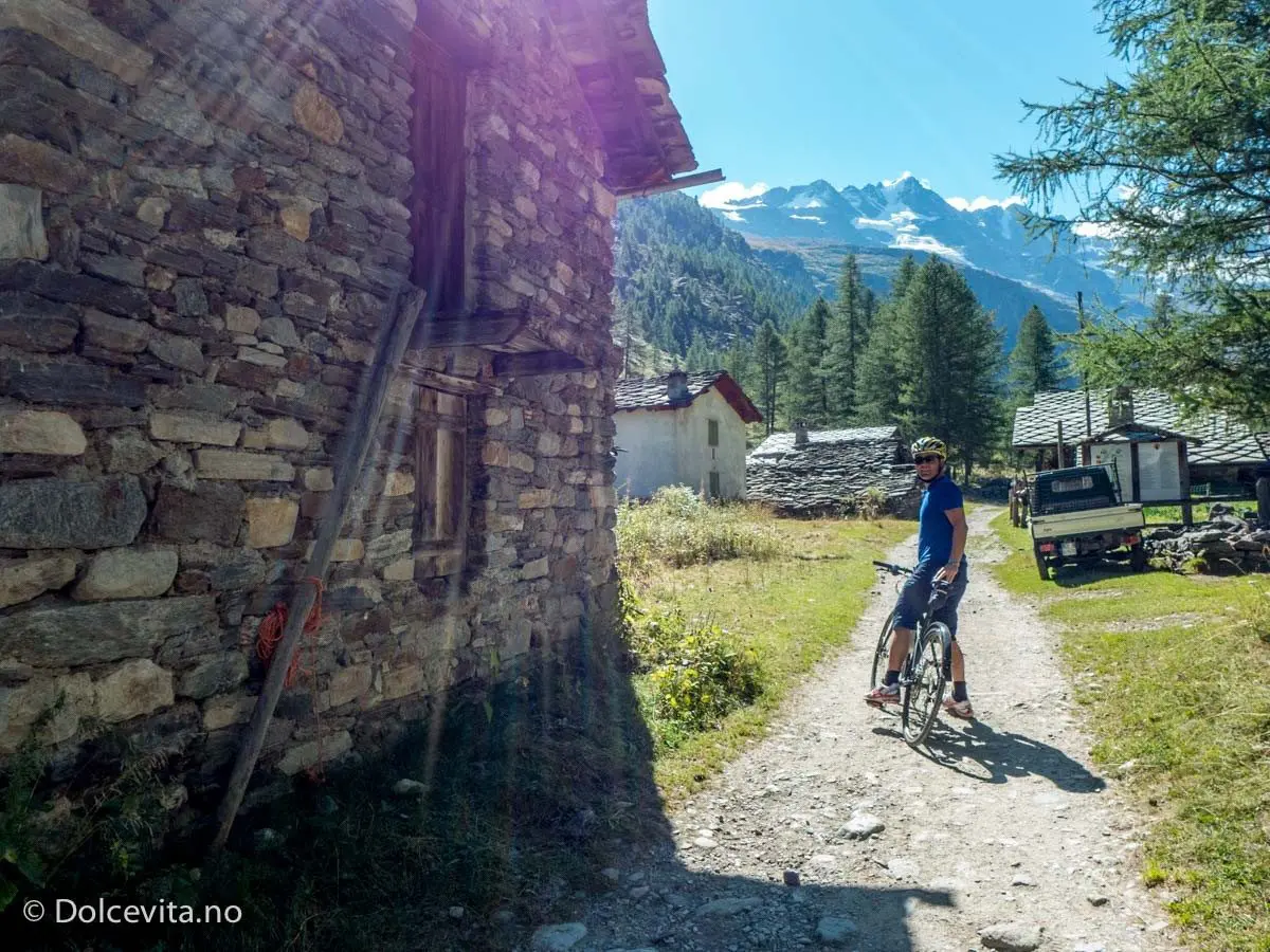 Men vi vil ha mer. Opp en annen sidedal. Det er asfalt det første stykket, og i Lillaz passerer vi en slåmaskin fra en annen tid. Noen plukker noe som likner på bringebær. Det er et par åkre på størrelse en halv håndballbane hver der det dyrkes mat. Men så er vi alene. Det er bratt og trilleføre.